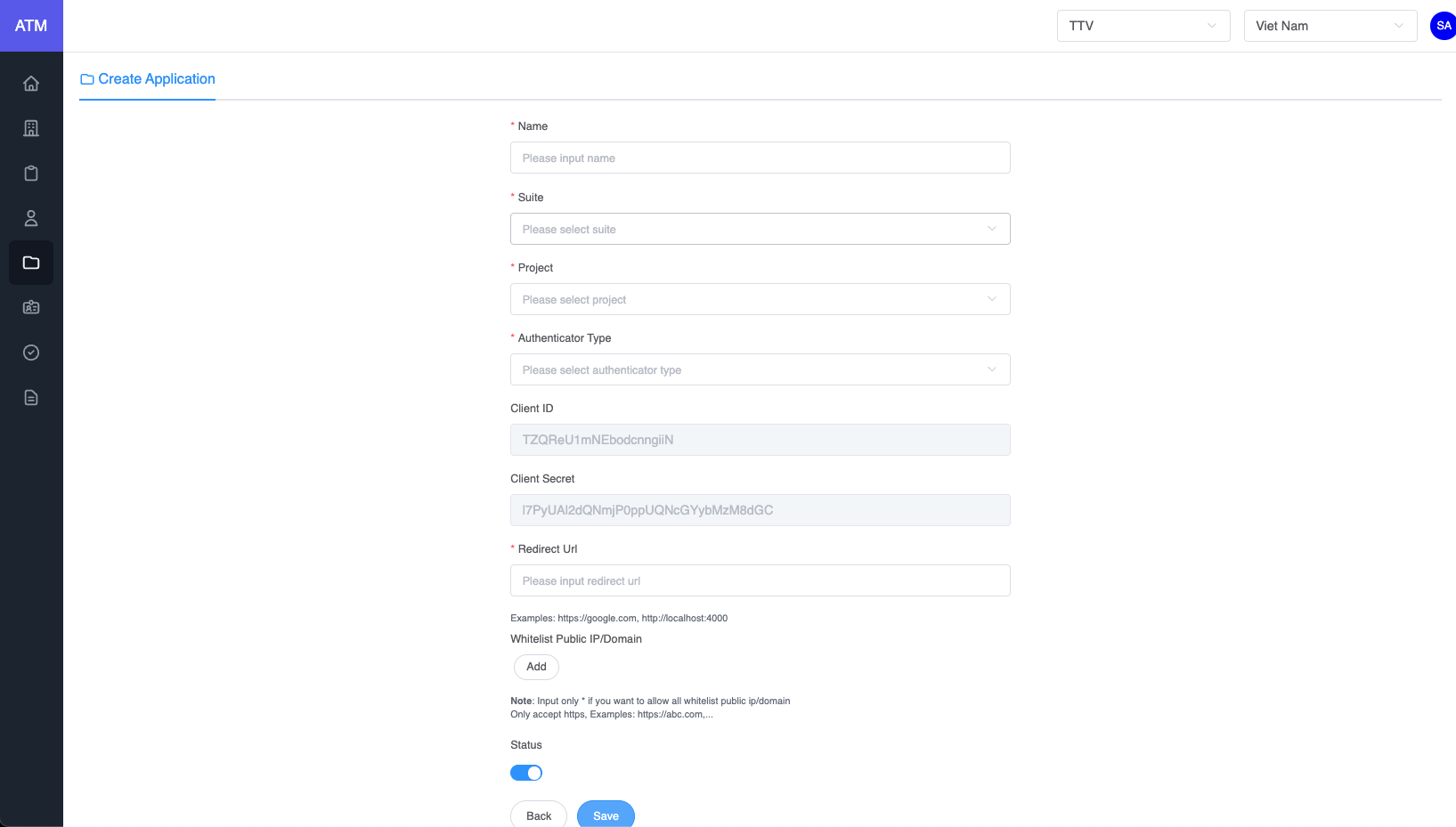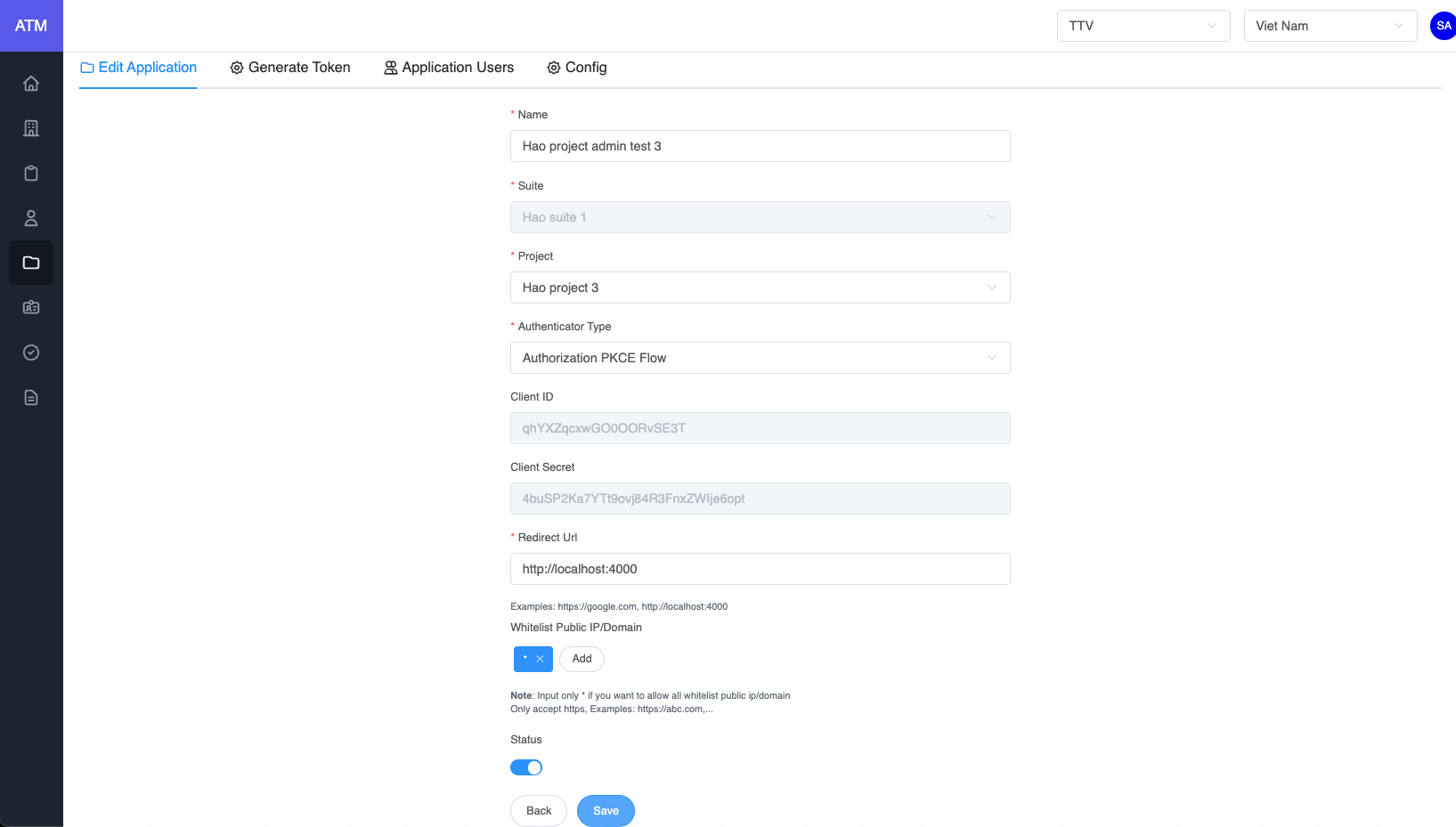 • If the applicaion's authenticator type is User Credential, enable or disable the toggle to remove the user if needed