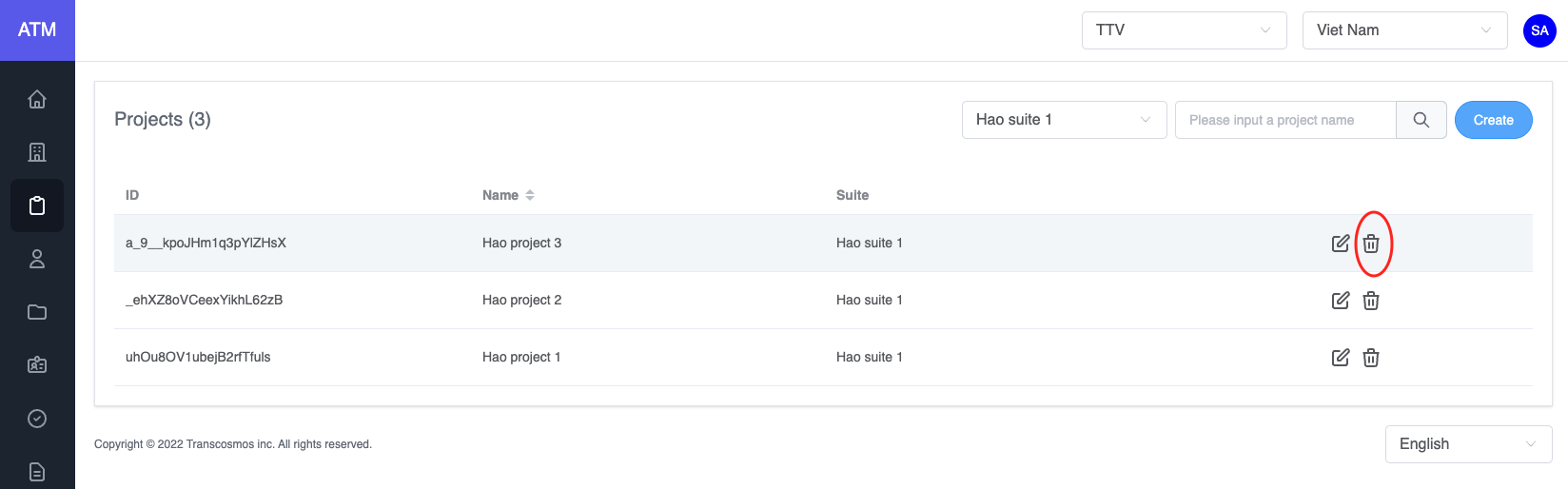 • Warning: If the project had an application or user, you can not delete it and the system will display an error message. Please delete application or user of this project and then delete project