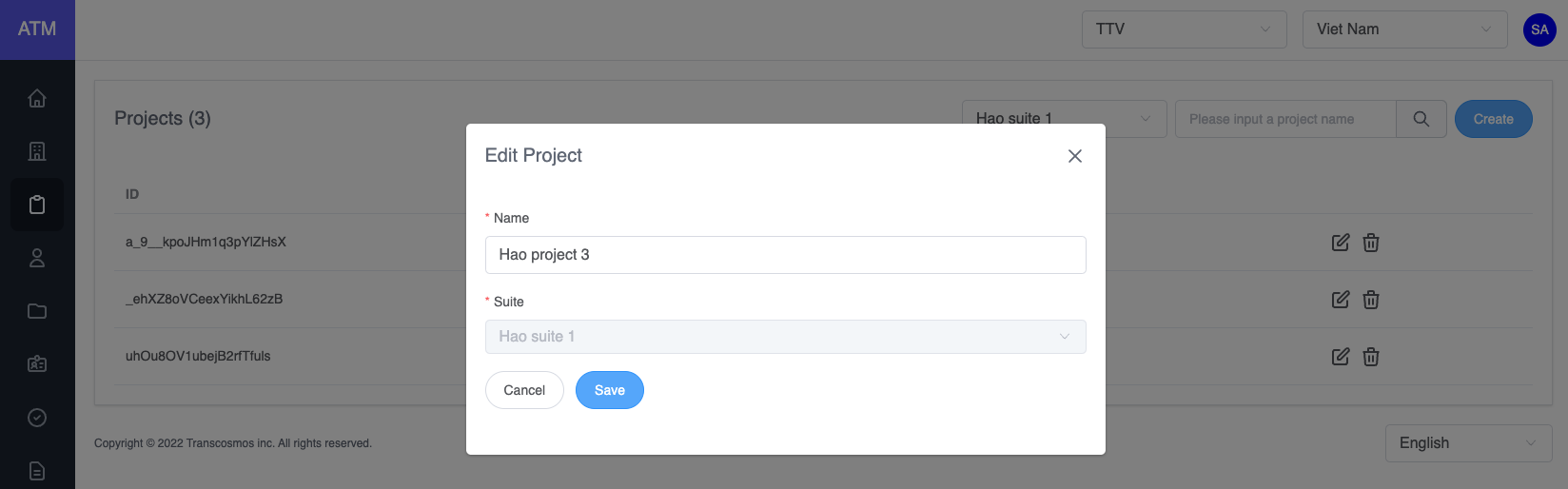 • The Edit Project popup will be displayed, you can update the project's name